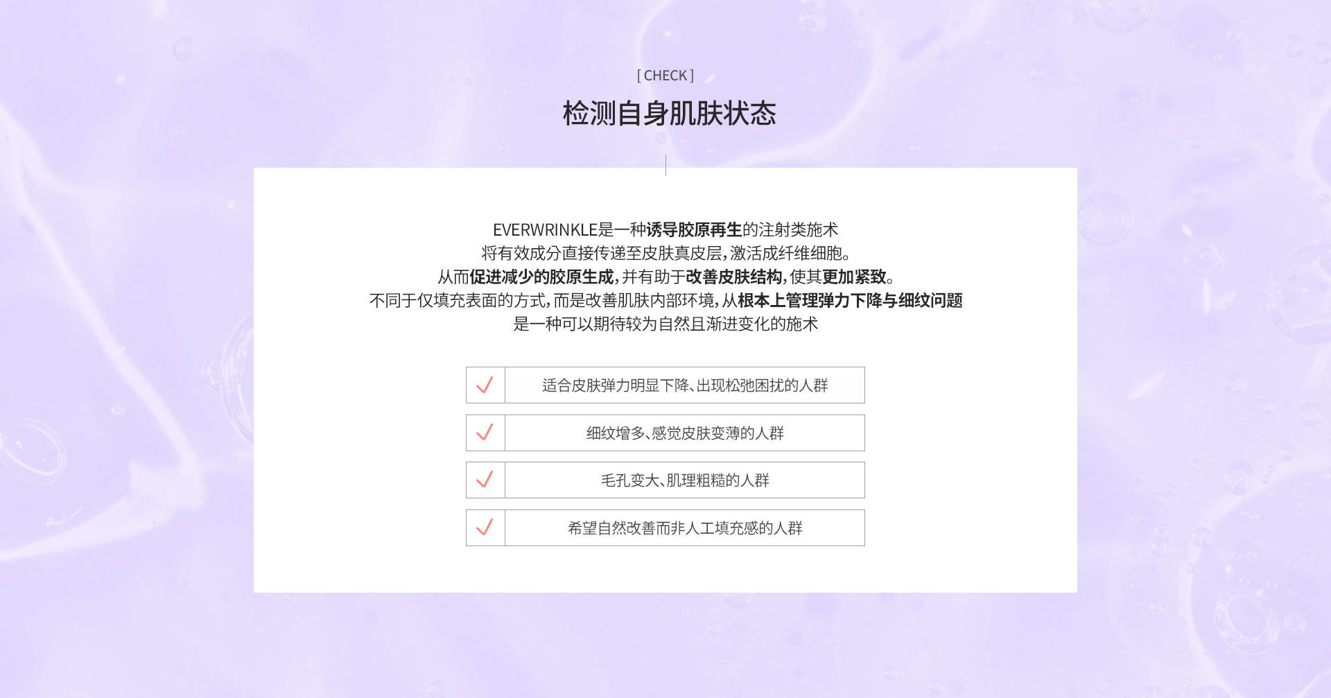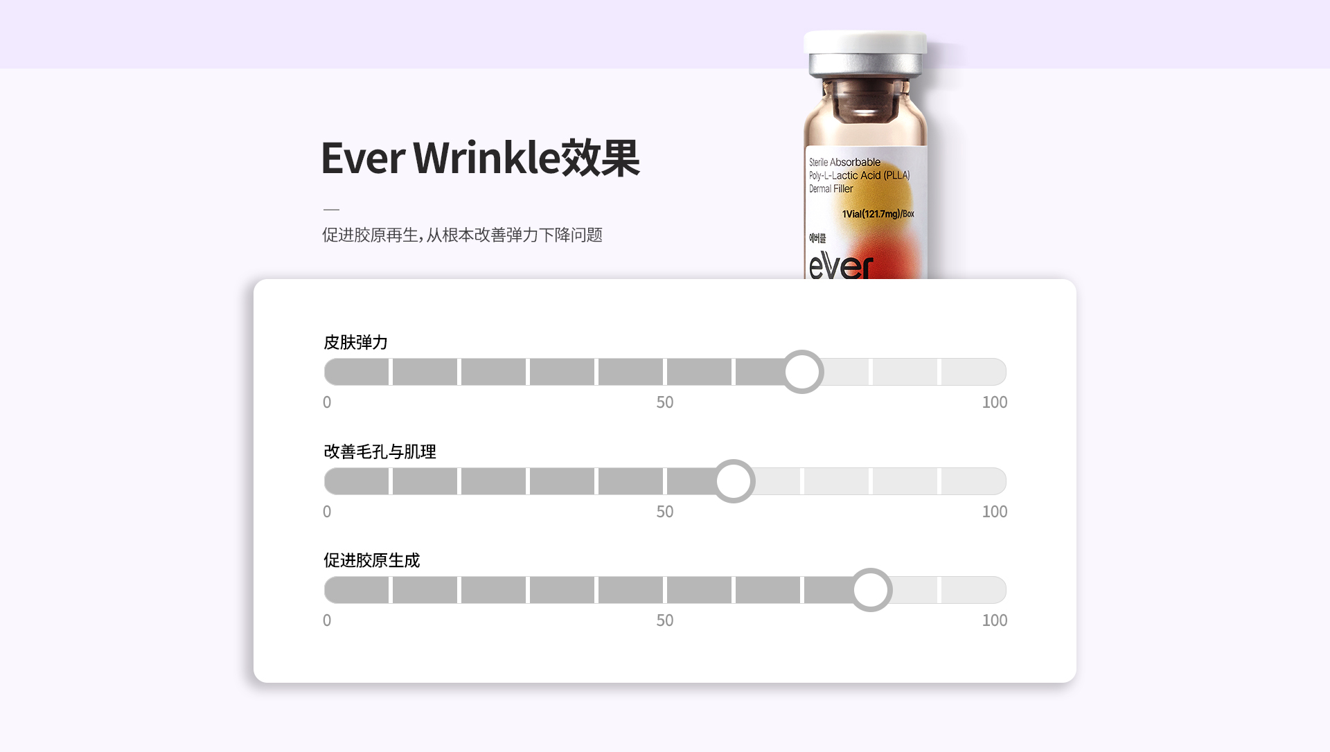 Ever Wrinkle 胶原蛋白针含有 PLLA 再生成分,可诱导自身胶原蛋白生成,帮助肌肤实现自我修复与再生。是一种有助于改善皮肤松弛、细纹及肤质的次世代肌肤再生注射疗程。