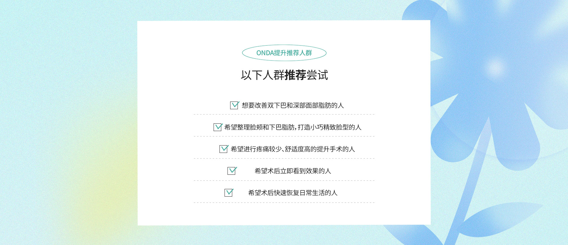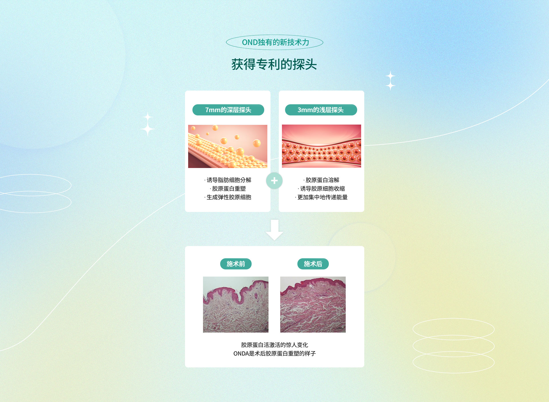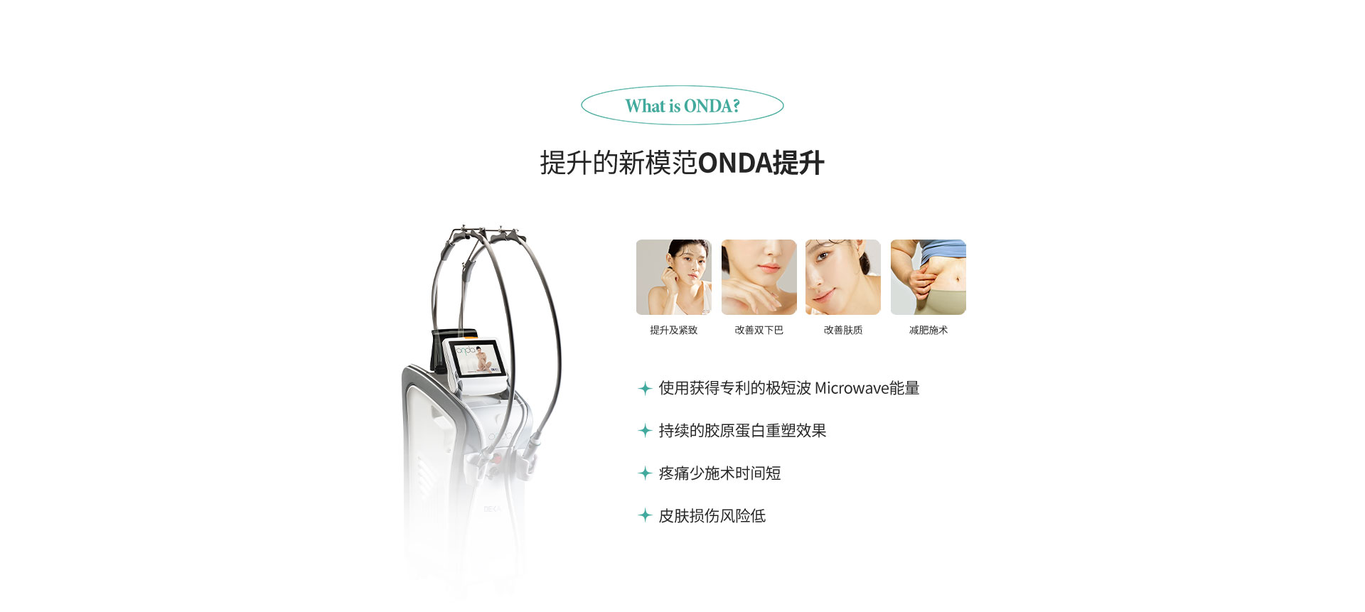 onda提升术利用专利超短波技术,将能量均匀传导至皮肤,疼痛感低、效果显著的紧肤疗程。